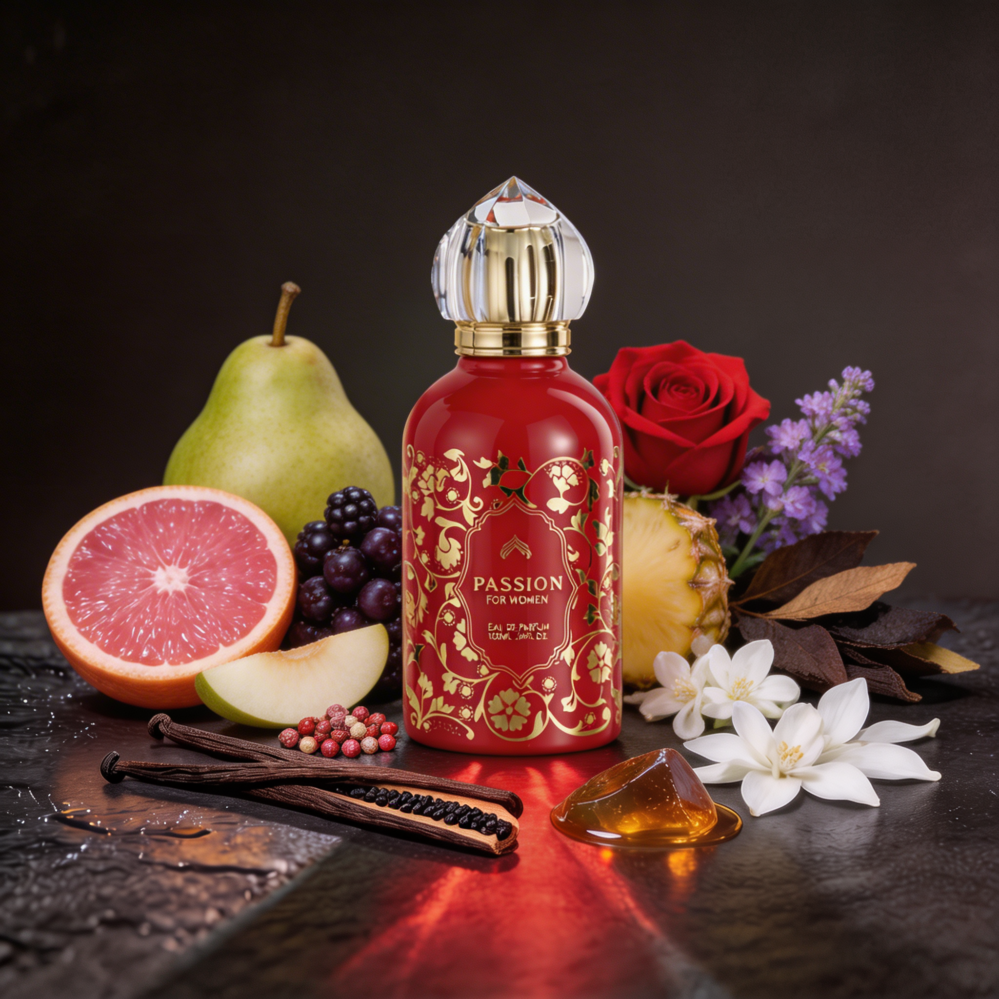 - Middle Notes: At its heart, a blend of romantic rose and delicate peony unfolds, adding a lush and floral depth that enhances the fragrance's passionate character.